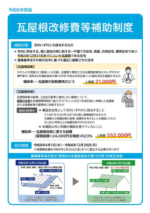 令和6年度から始まった安城市の「瓦屋根改修費等補助制度」が、令和8年度も継続して実施されることとなりました。